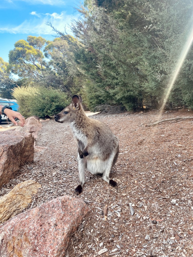 Bay of Fires naar Freycinet National Park: van de prachtige witte stranden van de Bay of Fires vertrokken wij richting het Zuiden. Wij verbleven 1 nacht in het Freycinet nationaal park. Er is hier onwijs veel te doen maar wij kwamen speciaal voor Wineglass Bay. Het beroemdste strand van Tasmanië vormt een perfecte witte bocht en is veruit het meest populaire – en fotogenieke – natuurlijke kenmerk van het park. Via een korte wandeling omhoog, waar je wellicht nog wordt begroet door rotskangaroes, loop je zo naar het uitkijkpunt van Wineglass Bay.