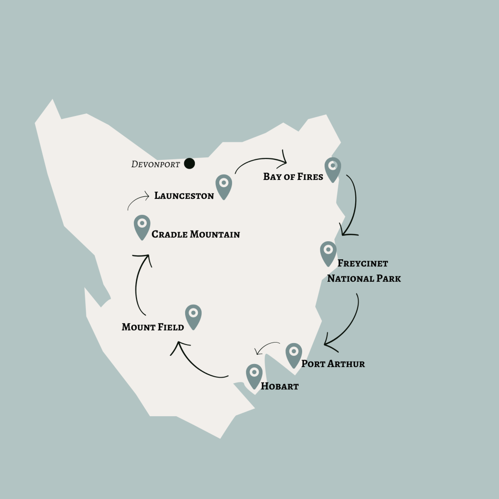 We nemen je graag mee in de perfecte roadtrip door Tasmanië. We beginnen onze reis in het hart van het eiland, in de bruisende stad Launceston, en trekken dan langs de spectaculaire oostkust, door historische locaties en adembenemende natuurlijke wonderen, om uiteindelijk te eindigen in de majestueuze bergen van Cradle Mountain.
