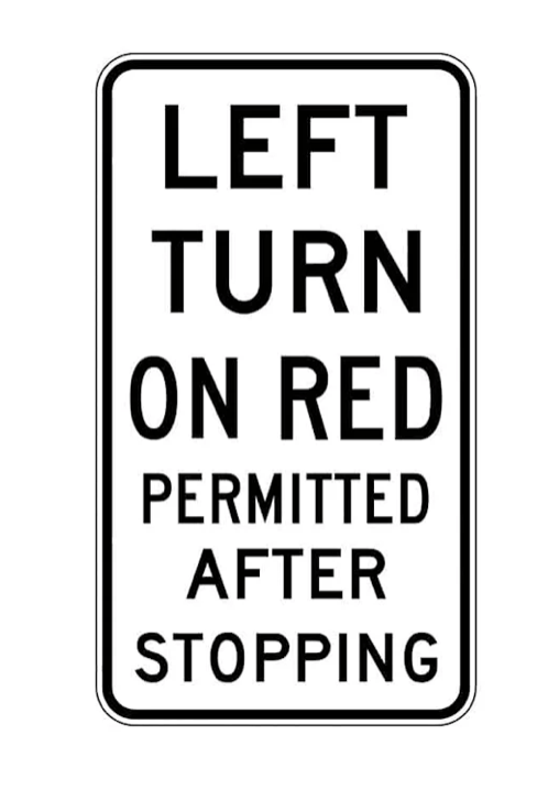 Het ‘Left turn on red permitted after stopping’ bord, signaleert dat je bij een rood licht altijd mag afslaan, nadat je volledig hebt stilgestaan en voorrang hebt verleend aan al het naderende verkeer.