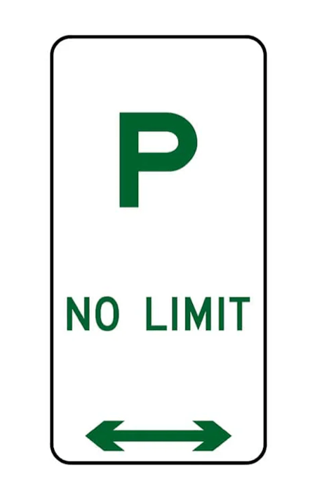 Een wit bord met zwarte rand en vaak met zwarte en groene tekst signaleert dat parkeren is toegestaan. Het bord hierboven laat zien dat parkeren is toegestaan zonder limiet en parkeren mag zowel links als rechts van het bord.