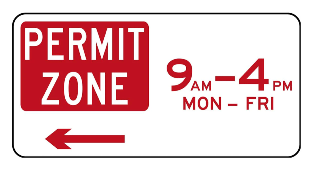 Dit bord laat zien dat vergunning nodig hebt in de richting van de pijl tussen de getoonde dagen en tijden.